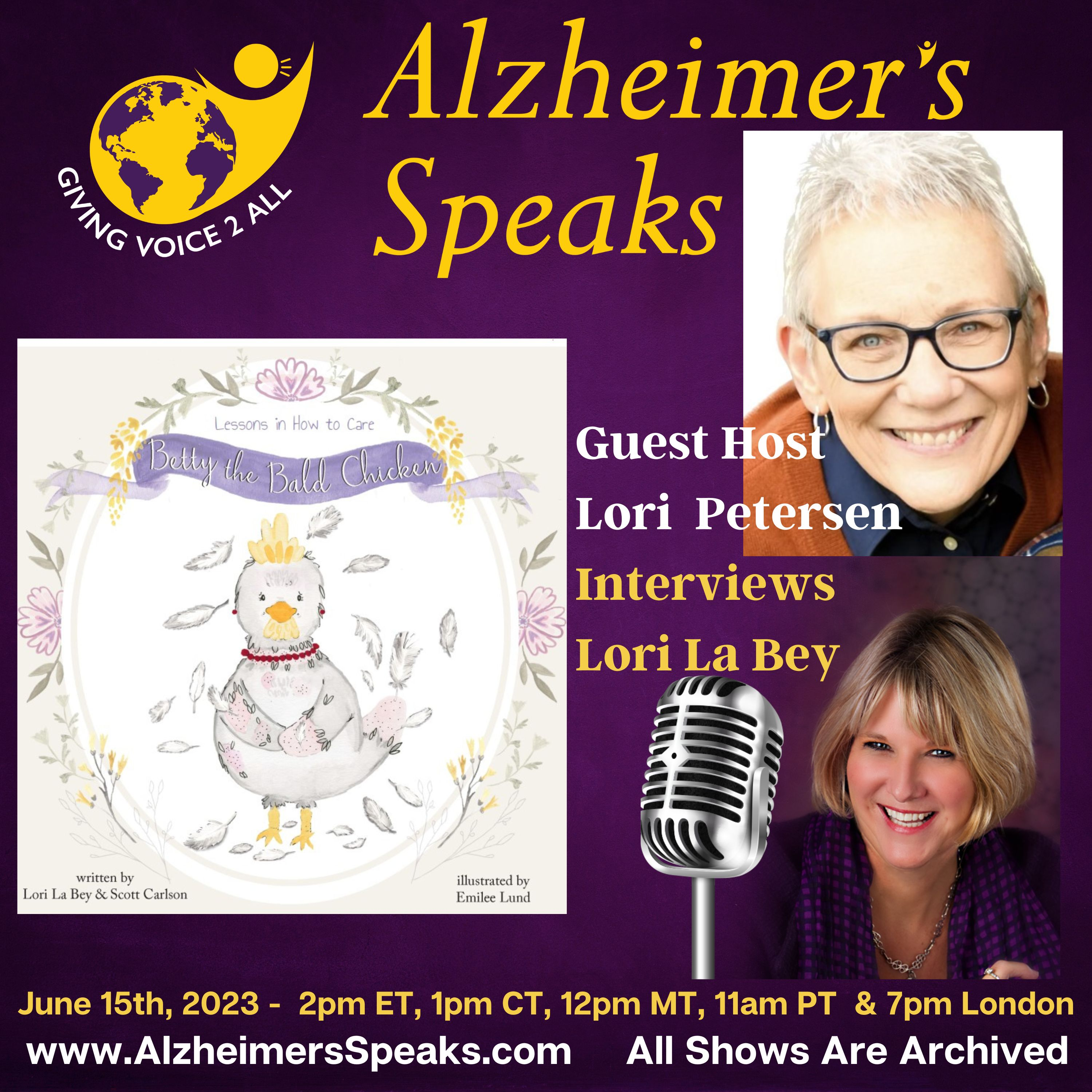 Today on Alzheimer’s Speaks Radio, roles are reversed as Lori Petersen a passionate dementia advocate interviews our radio host, Lori La Bey about her children’s book Betty the Bald Chicken – Lessons in How to Care. Join us as we learn the history of the story, who was involved in the development of the children’s book, and how it is uniquely positioned as a multi-purpose book in a variety of fashions.